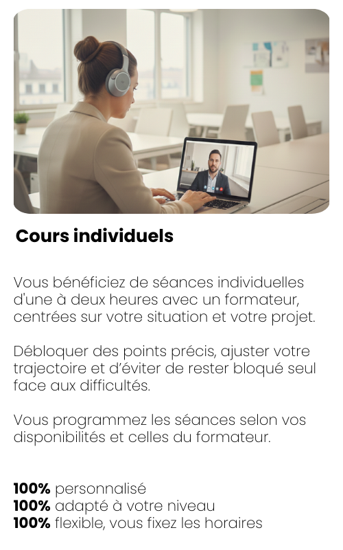Les notions sont abordées de manière progressive, avec une pédagogie orientée compréhension et mise en pratique. Vous avancez étape par étape, à votre rythme, sans pression, avec un accompagnement humain.