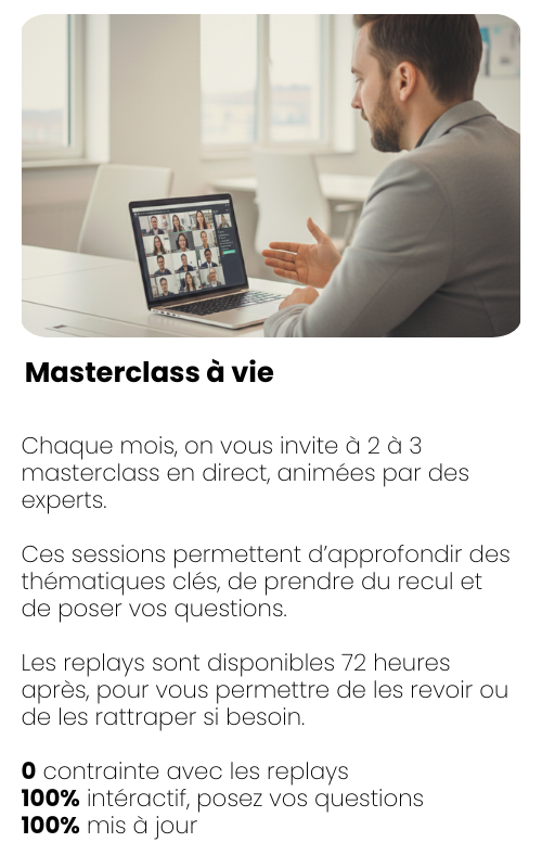 Ces échanges permettent de travailler sur votre situation réelle, de débloquer des points précis et d’éviter de rester seul face aux difficultés. Des masterclass régulières complètent l’accompagnement pour approfondir certains sujets et rester à jour.